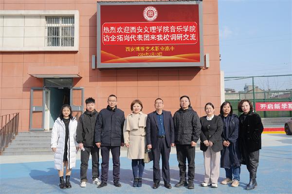 为拓宽毕业生就业渠道,深化校校合作,助力毕业生高质量就业,3月13日下午,公司党总支书记贺星、教学副经理郭瑞玺、党总支委员高婧、音乐表演专业系主任王翊、学工办主任董小蕾前往西安博雅艺术职业高中开展访企拓岗,西安博雅艺术职业高中董事长张胜强、副董事长赵伟、副董事长兰乐、音乐教学部主任李娜陪同参观并交流座谈。