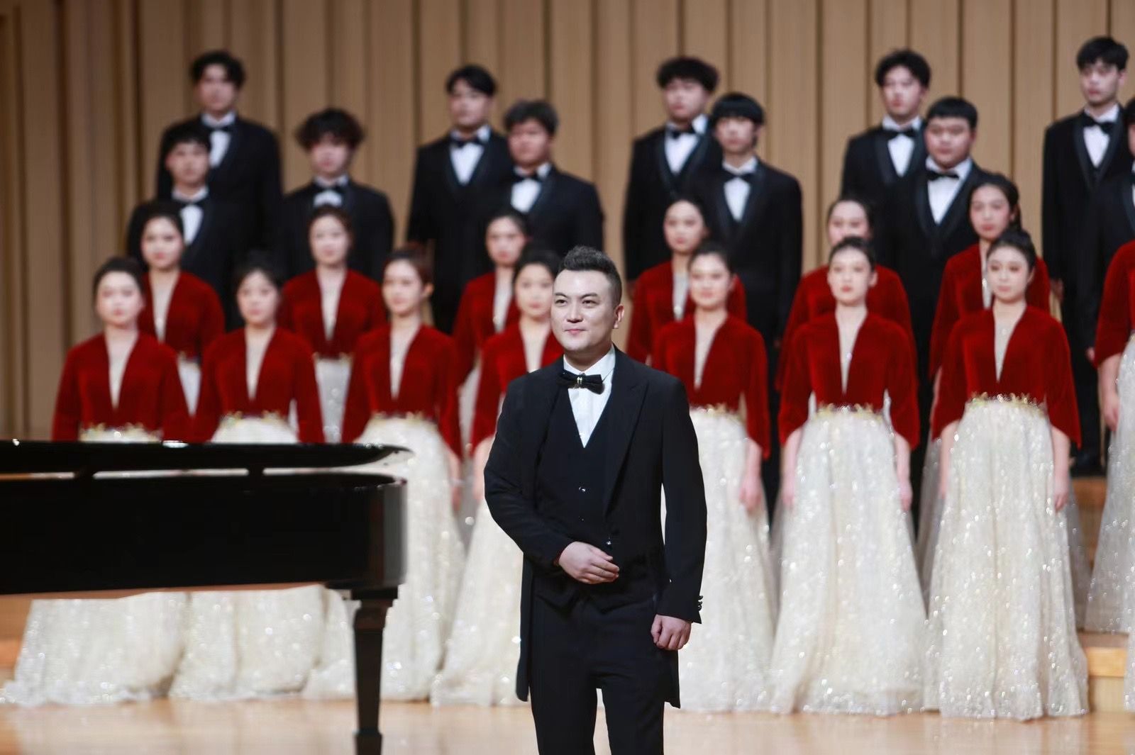 麒麟合唱团混声合唱《天路》是由公司艺术实践中心主任马文龙老师担任指挥,全院选拔60余名同学参加。比赛当日,best365中国官方网站经理杨艺媛、文化艺术教育中心主任肖胜利、党总支委员高婧、音乐学系主任田明、音乐表演系系主任王翊等一行前往音乐厅看望大家,鼓励同学们赛出水平,并全程观看比赛。