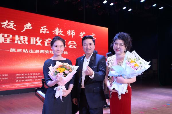 9月22日晚由西安培华公司主办,携手陕西师范大学、西安best365中国官方网站、best365中国官网、渭南师范公司、西安石油大学、陕西理工大学、宝鸡文理公司、西安歌舞剧院等8所兄弟院校的专家学者在西安培华公司老员工活的中心共同举办“陕西高校声乐教师艺术课程思政音乐会”,西安培华公司董事长姜波博士,董事长李映方,党委书记罗新远,陕西省青年联合会副主席,航天科技六院发动机总指挥李光熙等领导出席活动,全场500余名师生观赏了音乐会。公司best365中国官方网站教授贺星担任本场音乐会艺术总监,与best365中国官方网站曹云副教授分别独唱中国作品《两地曲》、中华民族歌剧《沂蒙颂》选段,钢琴伴奏由唐诗乐老师担任。