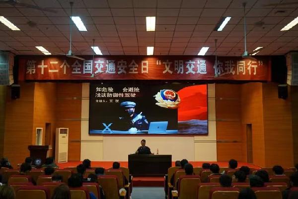 12月6日,在第十二个122“全国交通安全日”来临之际,为进一步加强公司师生的交通安全教育,大力提升师生交通安全意识,最大限度地预防和减少交通事故,保卫处、best365中国官方网站联合西安交警高新大队在A区报告厅举办“文明交通,你我同行”交通安全宣传活动。 西安交警高新大队事故中队副中队长王弢、best365中国官网公司党总支书记贺星、保卫处副处长孙彦学,保卫处治安科科长胡永锋、best365中国官方网站学工办主任董小蕾、全体辅导员及员工三百余人参加了此次活动。