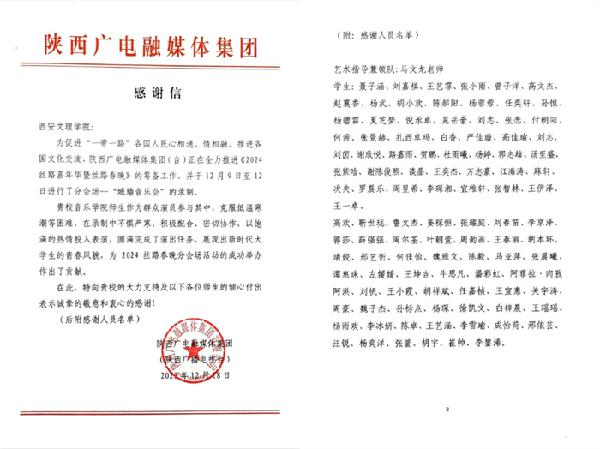 近日,best365中国官方网站收到陕西广电融媒体集团感谢信,对公司组织师生参与2024丝路春晚活动表示感谢。