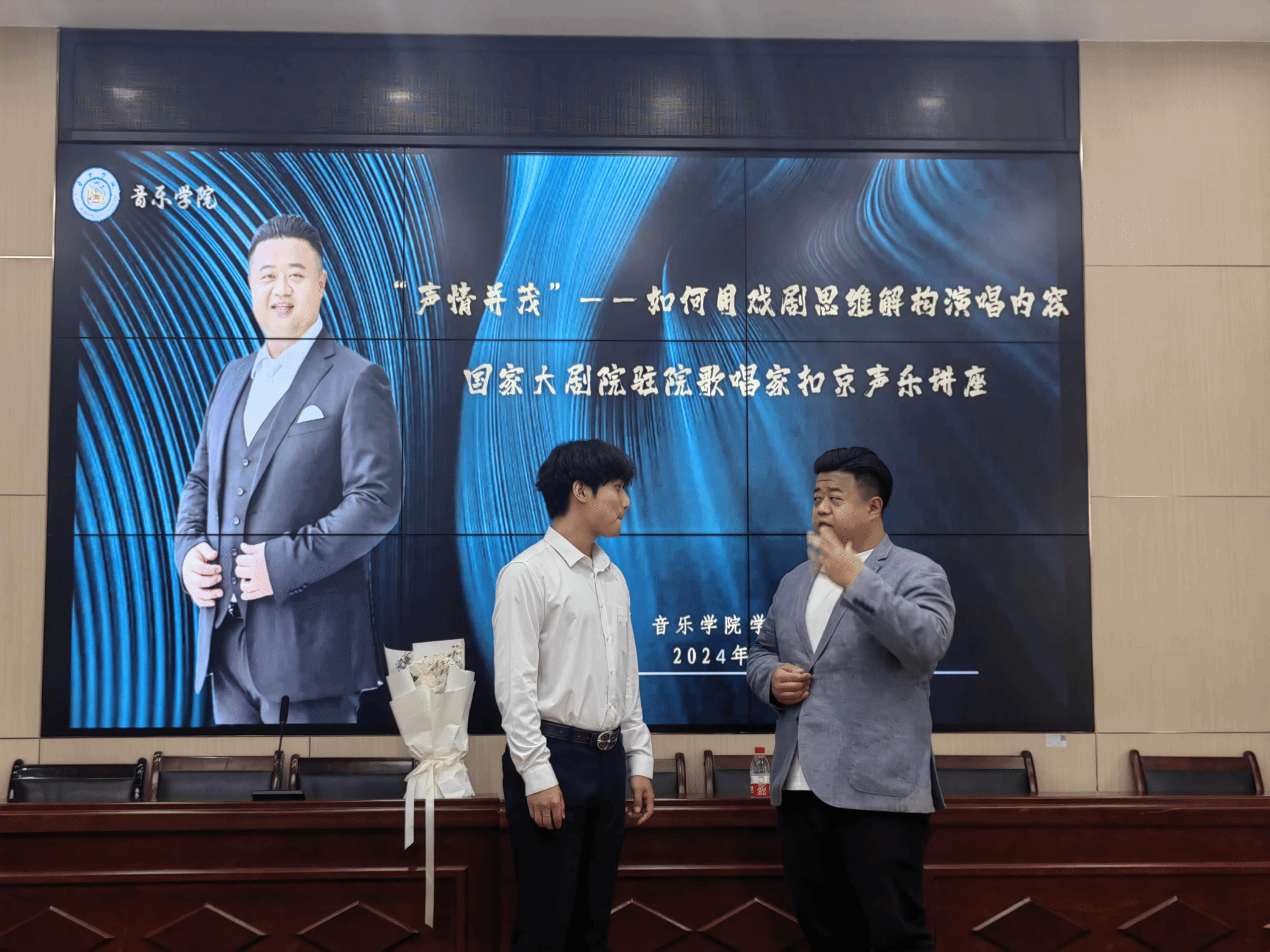 讲座中,扣京老师为公司四名同学在声乐演唱与表演上进行了详尽的指导,歌剧《茶花女》中的男女生二重唱《让我们远离巴黎的喧嚣》,男女主人公在对未来憧憬下掩藏的深深哀叹;《再别康桥》的《一半》里男女主人公对未来的甜蜜向往;《两地曲》中对爱人的声声呼唤,都在扣京老师声情并茂的讲解下展示的淋漓尽致,让师生们感受到浓浓的音乐艺术魅力。最后扣京老师为大家演唱了著名男高音歌曲《负心人》,更是余音绕梁,把讲座推到了高潮,使观众久久沉醉其中。
