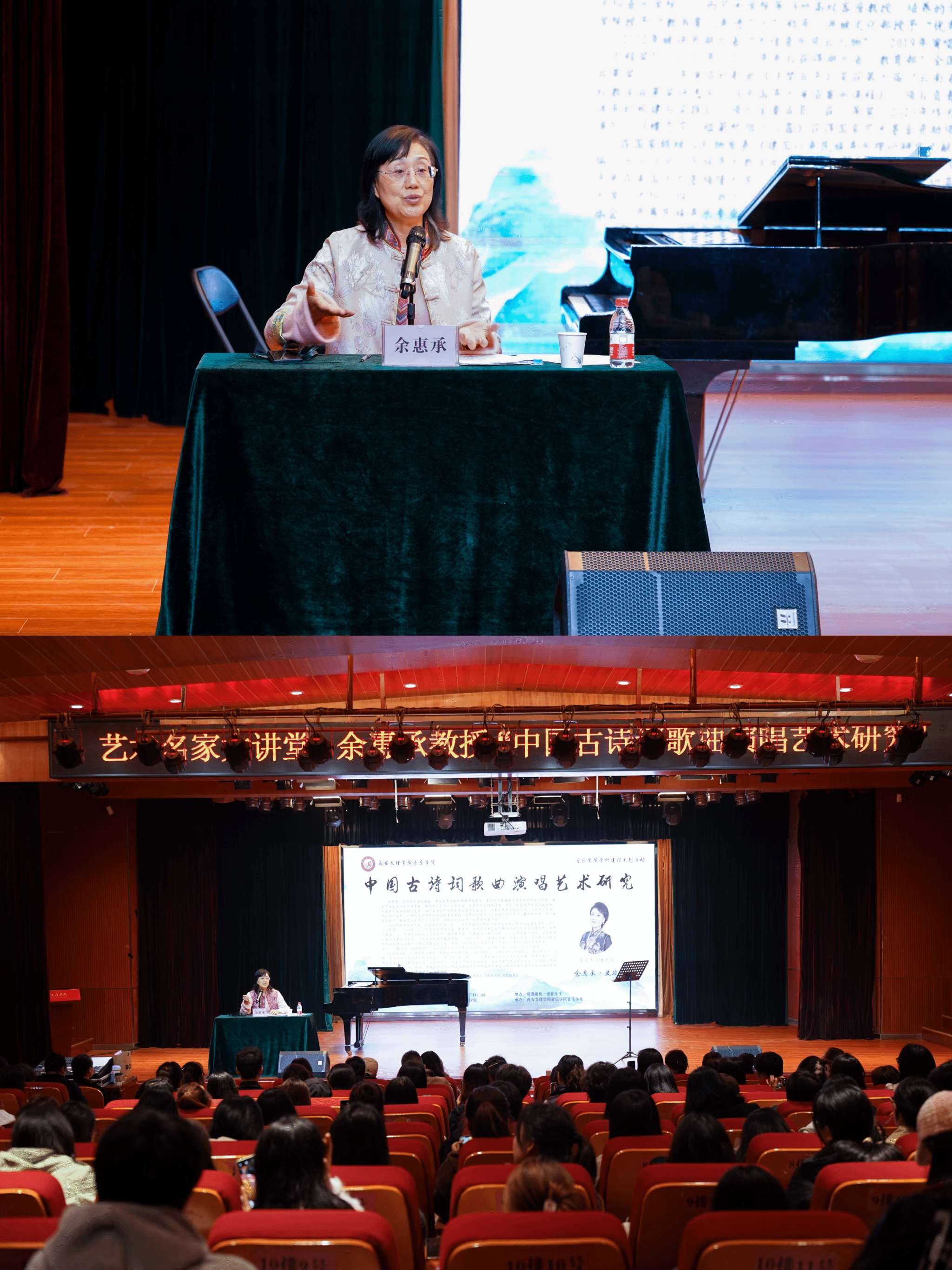 此次学术讲座持续三个半小时,余惠承教授作为一名活跃在声乐舞台上近40年的艺术教育工作者,首先分享了自己宝贵的教学经验与多年的演唱心得,深入探讨了古诗词声乐艺术的核心价值及其魅力。讲座中,余教授对best365中国官方网站的三位声乐教师及三位员工进行了一对一的演唱指导,为每位演唱者的谱面做了详细的笔记,并强调声乐学习中坚持做好案头工作是每位声乐学习者的必修课。演唱中进行耐心细致地指导与示范,强调音乐表现一定要源自内心,技术与情感并重、人声与伴奏相融。本次讲座全场学习氛围浓烈,并对公司师生的专业能力给予充分肯定。